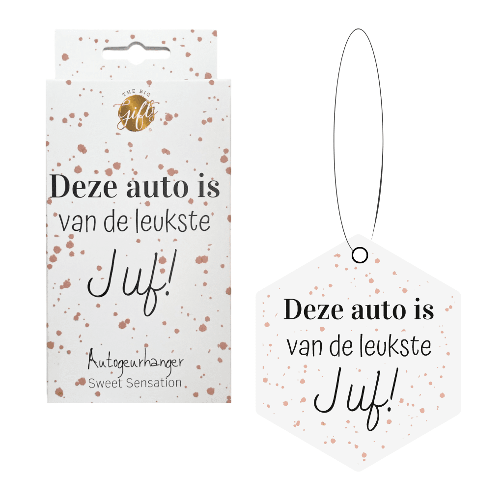 Een leuk bedankje aan het einde van het schooljaar? Verras je Juf met deze unieke autogeurhanger met als tekst “Deze auto is van de leukste Juf!”