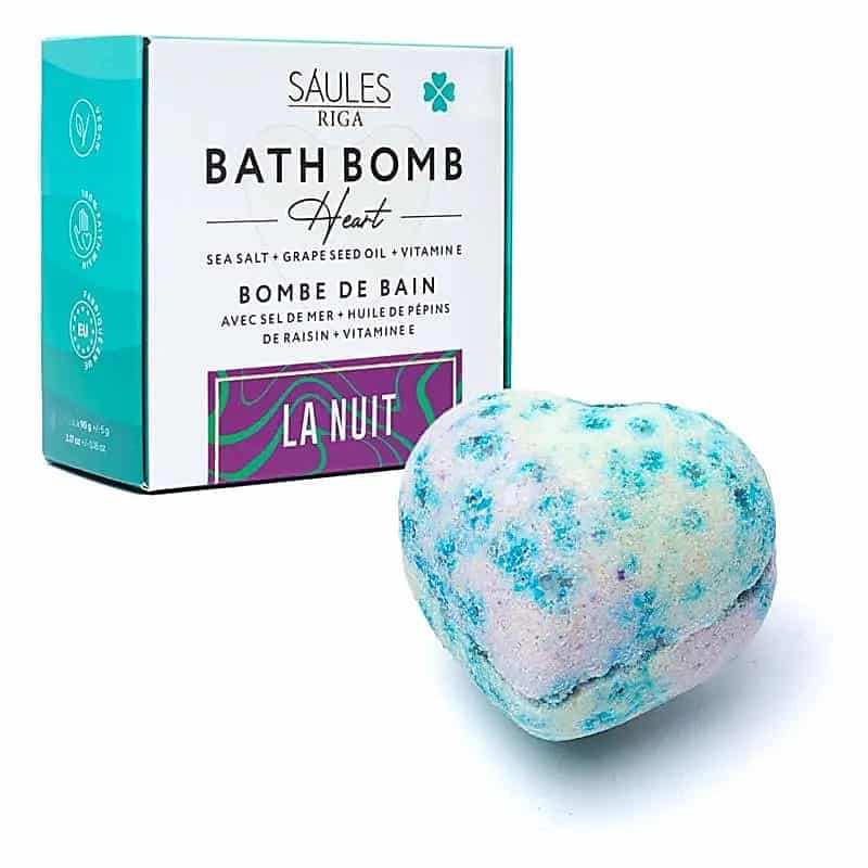 Deze bruisbal in hartvorm “La Nuit” heeft het volgende geurprofiel: een houtig warme, frisse en kruidige geur met noten van kardemom, citrus, komijn, bergamot, virginia ceder en lavendel. Geniet van het kalmerende bruisende badwater en laat je huid genieten van de voedende eigenschappen. De keuze van het type bruisbal hangt helemaal af van je stemming of behoefte op dat moment. Je kunt nooit de fout in gaan met de bruisballen van Sáules Riga. De kwaliteitsbruisballen van Sáules Riga zijn gemaakt met natuurlijke ingrediënten zoals natuurlijk zeezout en druivenpitolie, die samenwerken om je huid te hydrateren en te kalmeren.