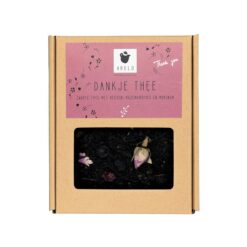 Iemand bedanken doe je met deze dank je thee, een heerlijke zwarte thee met bessen, rozenknopjes en moringa.