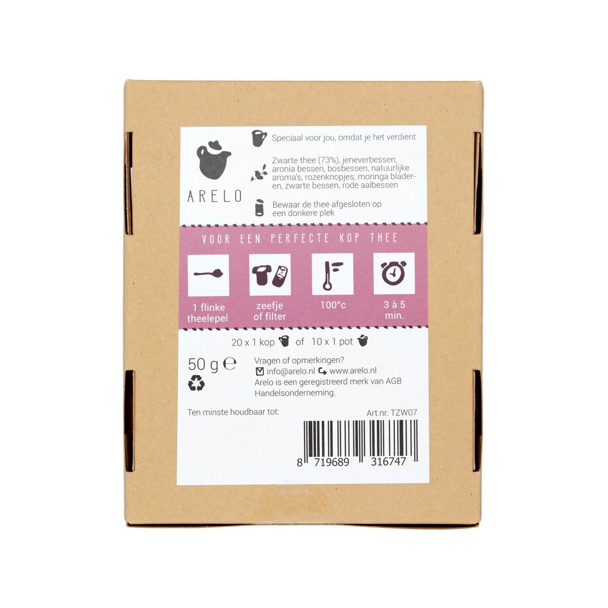 Zwarte thee (73%), jeneverbessen, aronia bessen, bosbessen, natuurlijke aroma, rozenknopjes, moringa bladeren, zwarte bessen, rode aalbessen.