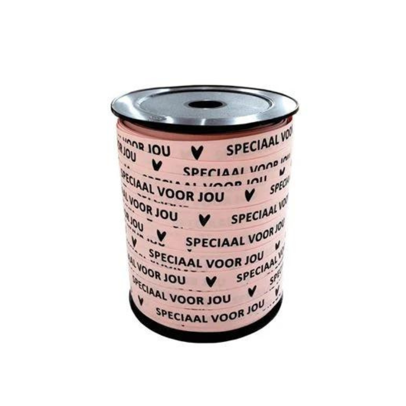 Lichtroze paperlook krullint met zwarte opdruk “Speciaal voor jou”. 1 cm breed en wordt geleverd per 10 meter.