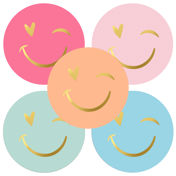 Ronde cadeau stickers in feestelijke kleuren blauw, groen, oranje, roze en lichtroze met goudfolie Smiley als opdruk. Deze 5-pack is per 10 stuks te bestellen. Leuk te gebruiken als sluitstickers bij het versturen van post. Maar ook kunnen deze cadeau stickers gebruikt worden bij het maken en versieren van geschenken en traktaties. Laat je ideeën de vrije loop!