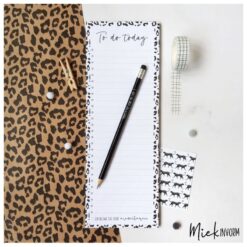 Superhandig notitieblok, in een toffe panter print met op iedere pagina de vrolijke quote “een nieuwe dag voor avonturen”.