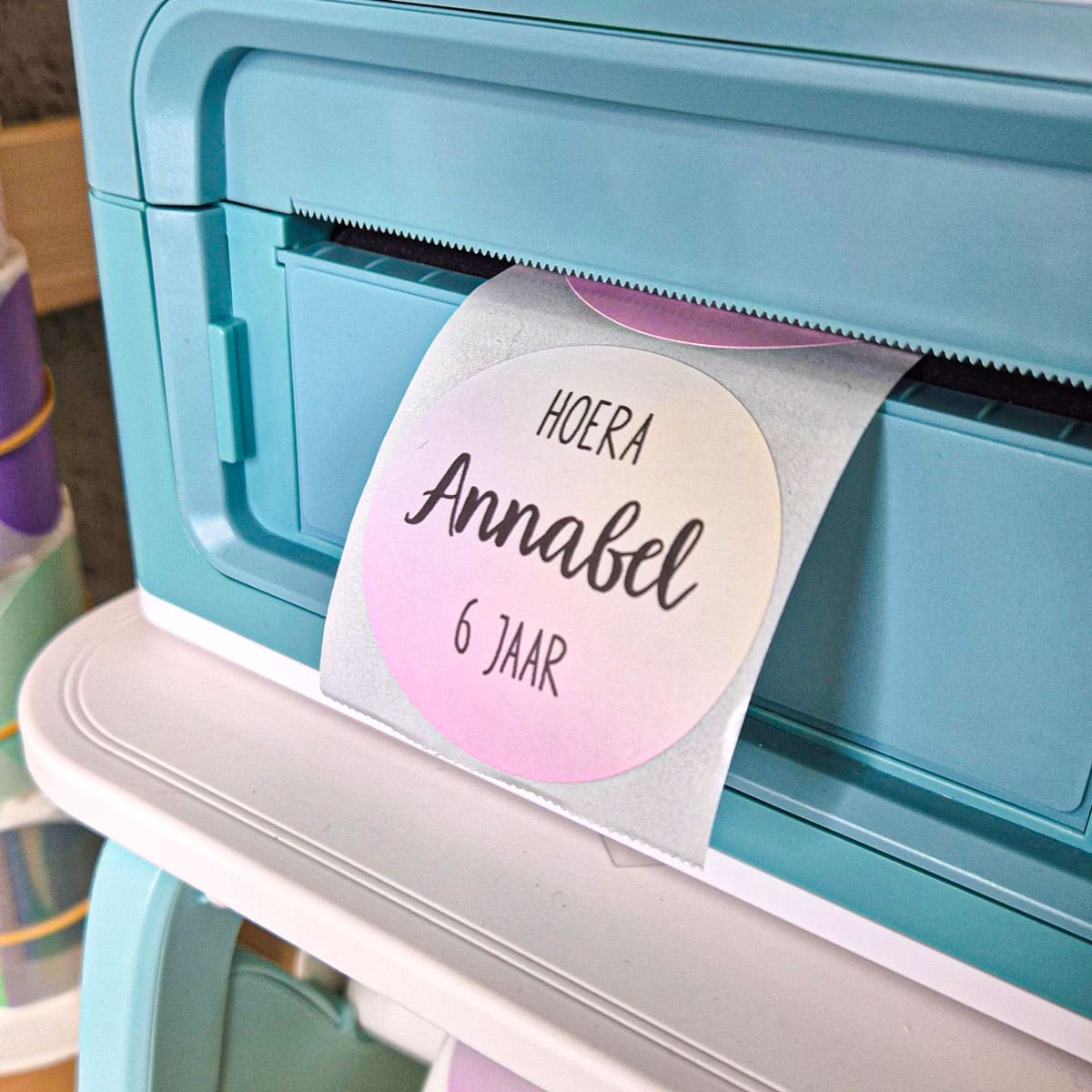 Bij deze gepersonaliseerde stickers op rol, kun je uit verschillende kleuren kiezen. De opdruk is altijd zwart.