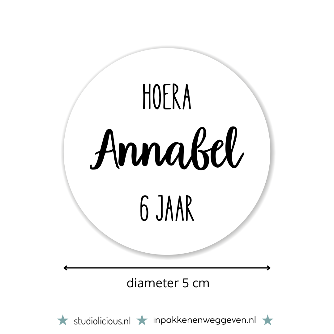 Is jouw zoon of dochter binnenkort jarig? Deze naamsticker met leeftijd met geschreven letters, waarvan de Naam in sierlijke letters, is super leuk om verjaardag traktaties te personaliseren. Je kunt deze stickers apart bestellen, of in combinatie met kant en klare kindertraktaties.