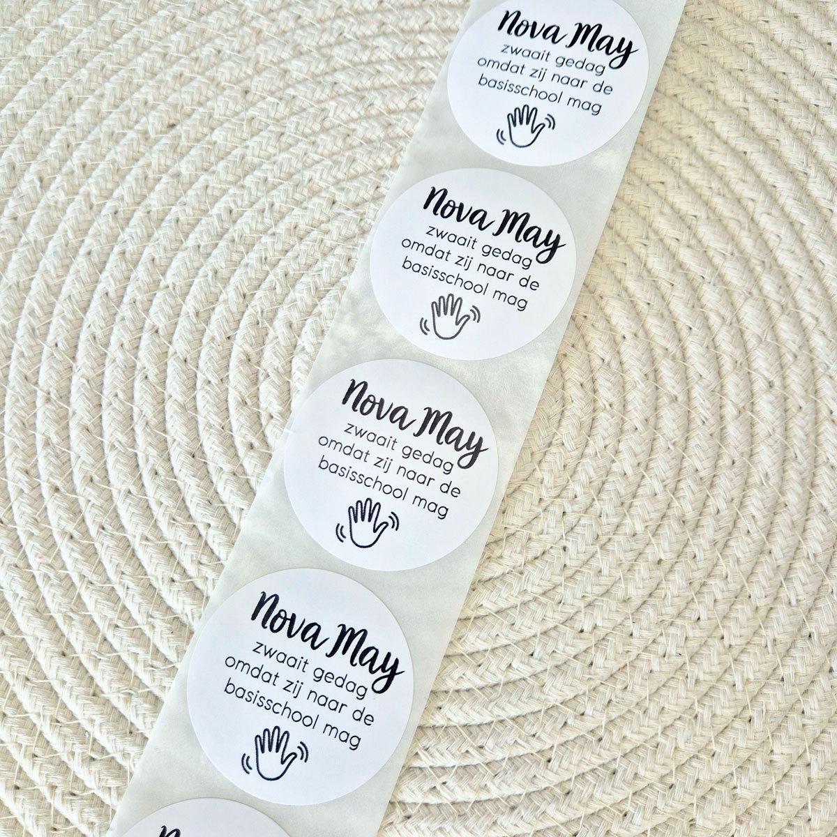 Gaat jouw dochter binnenkort naar de basisschool? Deze naamsticker met “*Naam* zwaait gedag omdat zij naar de basisschool mag” is super leuk om verjaardag traktaties te personaliseren en te trakteren op de kinderopvang. Je kunt deze stickers apart bestellen, of in combinatie met kant en klare kindertraktaties.